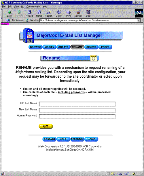 MajorCool is a Web interface to the Majordomo mailing list management tool. Whereas Majordomo is a rather unforgiving command-driven application that utilizes e-mail for effecting changes, MajorCool adds a Web-based front-end to provide a user-friendly interface to list manager operations.